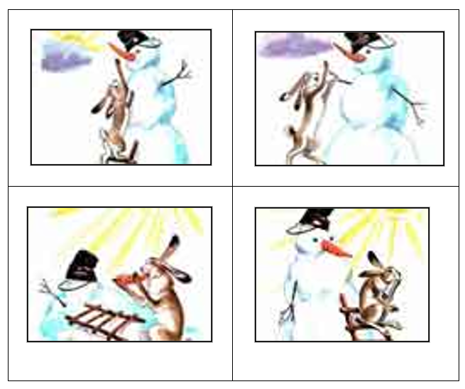 Зайка приставил лесенку, но и это не помогло зайке дотянуться до морковки. Голодный зайка зимой увидел у снеговика морковку вместо носа. Зайка смог достать и съесть морковку.Весной снеговик стал таять.