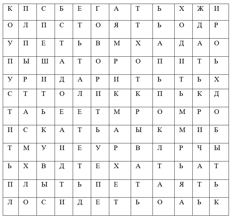 Найди слова: сбегать, бегать, стоять, ходить, ждать, пустить, искать, спешить, шить, плыть, сидеть, идти, лететь, говорить, торопить, пить, дарить, открывать, ехать, таять, ходить, ждать, добыть, кричать, петь.