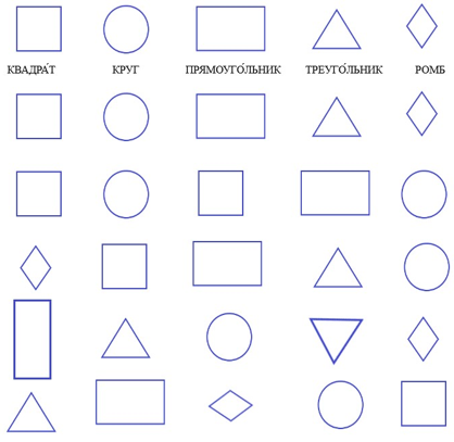 1. Зачеркни квадраты. Подчеркни круги. Закрась прямоугольники. Обведи треугольники. С ромбами ничего не делай.