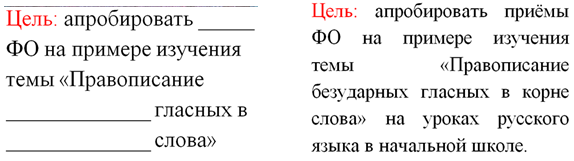 - Рассмотрим применение приёмов ФО на примере урока русского языка «Правописание безударных гласных в корне слова».