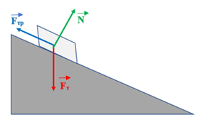 Решение: на брусок действуют три силы, точка приложения сил - центр тяжести тела. Стрелками показаны векторы сила тяжести (вертикально вниз), сила трения (вдоль наклонной плоскости, вверх), сила реакции опоры (со стороны поверхности, перпендикулярно поверхности, вверх).