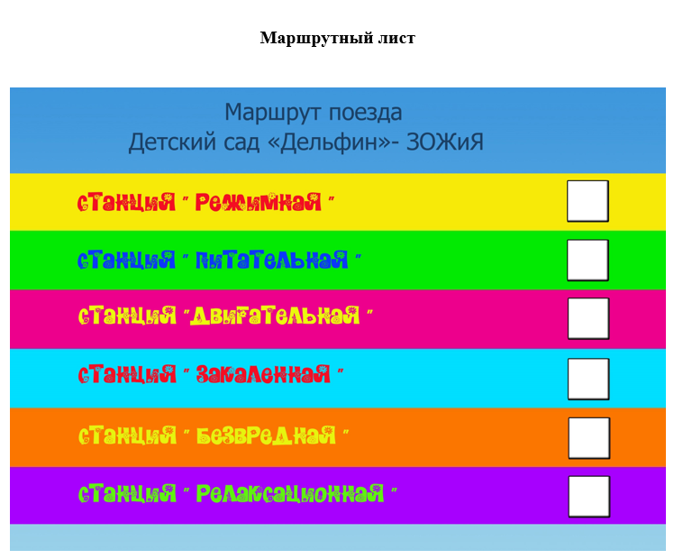 - Сегодня мы отправимся в путешествие на поезде в страну ЗОЖиЯ. Каждый из участников получил билет-приглашение на поезд. Прошу занять свои места. Во время игры вы посетите 6 станций, указанных в ваших маршрутных листах, которые являются компонентами здорового образа жизни. Желаем всем счастливого пути! (Приложение 1).