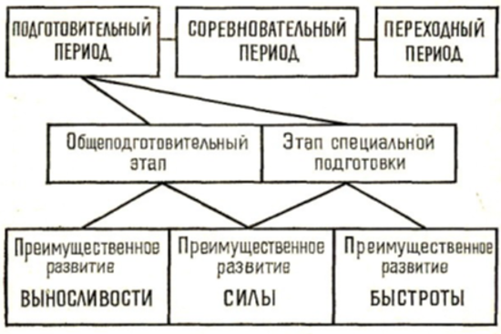 Рис. 1. Структура годичного цикла тренировки и этапы развития двигательных качеств спортсмена в подготовительном периоде