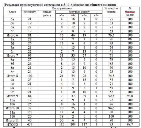 По результатам анализа промежуточной аттестации в 5-11-х классах по обществознанию успеваемость составила 99,7 % (оптимальный уровень), качество знаний 73 % (оптимальный уровень).