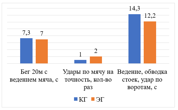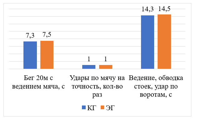 Анализируя таблицу 1, мы видим, что субъективная оценка техники выполнения технических приемов в контрольной и экспериментальной группах находится ниже удовлетворительного уровня. Визуально было оценено ведение мяча, удары на точность и в совокупности ведение мяча и удары на точность.