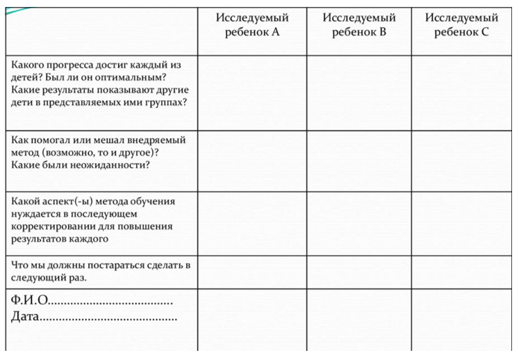 Заключительным этапом Lesson Study можно назвать обсуждение каждого урока в отдельности и результатов всех уроков вместе взятых. На данном этапе все педагоги, принимающие участие в цикле обсуждают как сработали выбранные методики на каждого конкретного ученика по отдельности и весь исследуемый класс в целом. Для упрощения работы педагогов и систематизации обсуждений была создана таблица, на которую опираются при обсуждении (рис. 4)