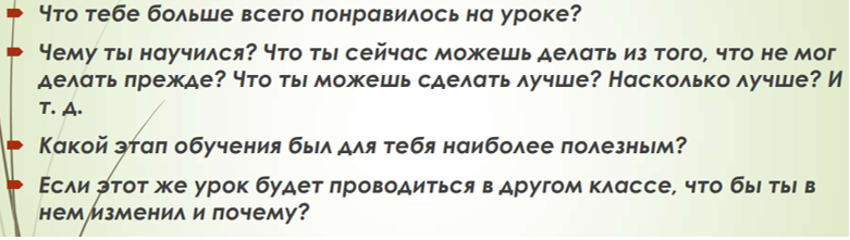 Следующим этапом в цикле Lesson Study является опрос «фокусных» учеников. Цель опроса – не оценка действий педагога, проводящего уроки в рамках цикла, а оценить действие методик на «фокусных» учеников. Для успешного опроса, чтобы учитель, проводящий его, не ушёл в оценку действий коллеги, а оценил именно воздействие методики, существует пример опроса (рис. 3).