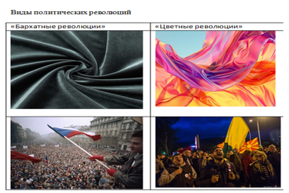 На консультации по подготовке к экзамену, обращаю внимание на особенности каждой из них, т.е. «Бархатная революция» - это смена политического режима, от тоталитарного к демократическому, путем переговоров (без применения силы) к митингующим. Её можно сравнить с мягкой бархатной тканью.