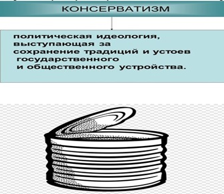 На уроке обществознания в 8 классе изучаются идеологические системы. Так при запоминании понятия – консервативное движение ученикам предлагается карточка с изображением консервной банки (рис.1). Задается вопрос: Каково свойство консервной банки? В ответ ученики отвечают – для сохранения свойств и полезности продукта. Соответственно, мы делаем вывод, что основной задачей консервативной идеологии это сохранение уже существующего политического строя.
