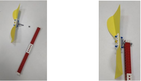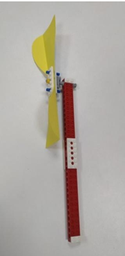 Вертушка готова, проверьте, одинаково ли согнуты лопасти. Они должны свободно вращаться. Если они не поворачиваются, это значит, что на ось вы забыли надеть серые втулки, они предотвращают трение лопастей о красную балку.