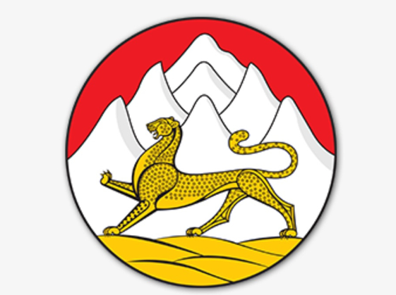Герб РСО-Алания Круглый шит с золотым барсом на фоне серебрянных гор и красного неба, символирующий историческую государственность и силу осетии..