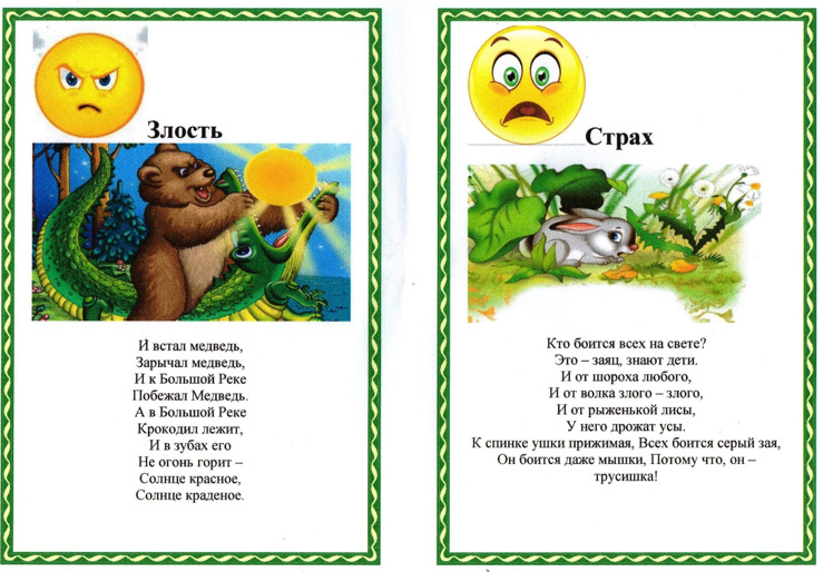 Цель: познакомить детей с эмоцией "страх". Задачи: - учить детей понимать свое эмоциональное состояние и других людей; - учить выбирать из множества иллюстраций и фотографий иллюстрации и фотографии людей, испытывающих страх; - учить способам преодоления страха; - развивать умение показать эмоцию через стихотворную форму; - учить изображать страх при помощи мимики; |