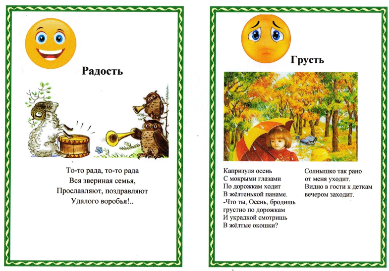 Цель: знакомство детей с эмоцией "радость" Задачи: - учить детей понимать свое эмоциональное состояние и других людей - учить выбирать из множества иллюстраций и фотографий иллюстрации и фотографии людей, испытывающих радость; - развивать умение показать эмоцию через стихотворную форму; - учить изображать радость при помощи мимики |