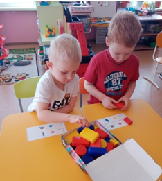 Для детей 3-4 лет блоки считаются эталонами формы и цвета. Манипулируя с ними, ребенок выясняет, что всякая фигура имеет цвет, форму, размер и толщину. Дети должны подобрать такую же фигуру по цвету, как у воспитателя (по форме, размеру). В середине года можно задавать два свойства для искомой фигуры.