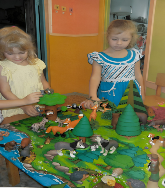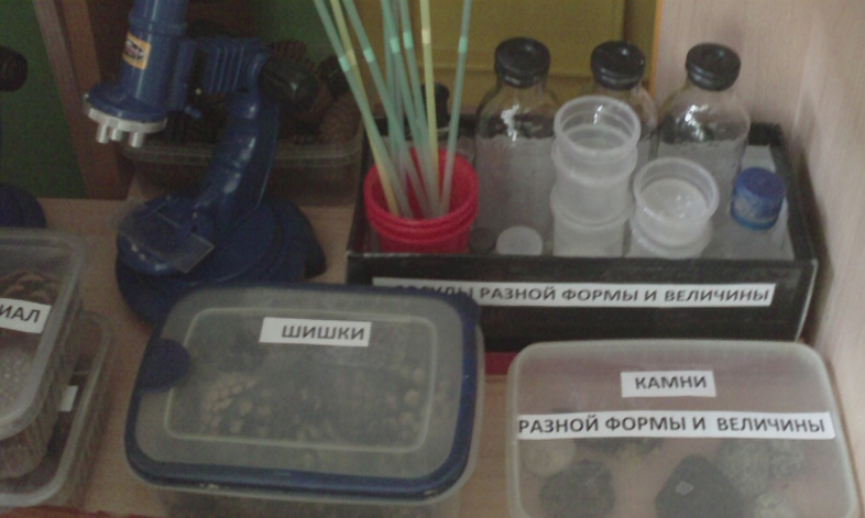 Развивающая среда: календарь погоды, календарь природы, одежда людей, игровой развивающий модуль «Животные леса», исследовательская лаборатория (природный материал, емкости разный формы и величины, песочные часы, микроскопы, увеличительные стекла, фонарики, металлические пластины, стеклянные шарики, деревянные предметы, различные крупы, кинетический песок, энциклопедии, журналы с изображением животных и растений).