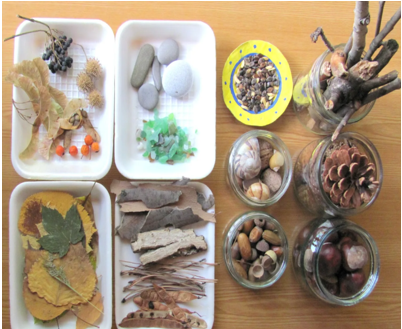 - природный материал: камешки, глина, песок, ракушки, шишки, перья, мох, листья и др.;