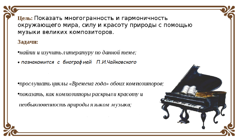 Одним из известнейших творений П И Чайковского является цикл «Времена года» который состоит из 12 пьес посвящённых 12 месяцам.