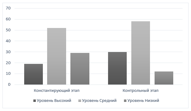 Обобщающий эксперимент проводился с целью проверки гипотезы о положительном воздействии проведенной работы на повышение уровня нравственного сознания дошкольников. Был проведен повторный мониторинг уровней сформированности нравственных ценностей у дошкольников. Динамика мониторинга представлена на диаграмме (рисунок 3).