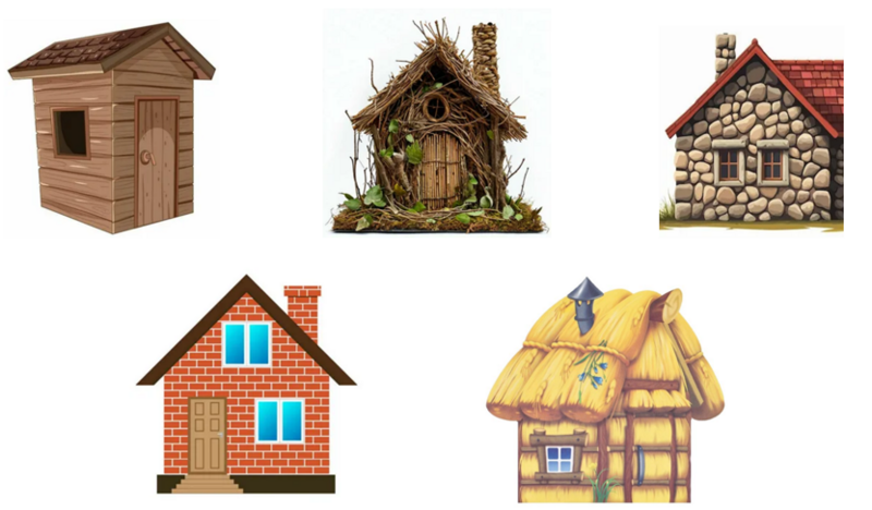 В.: - Посмотрите, какие разные дома у меня на картинках. Из чего они сделаны? (Из кирпича, досок, веток, камней, соломы.)