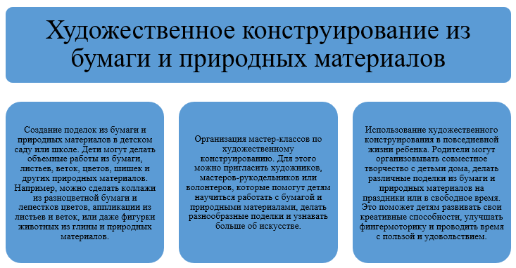- Основная часть. Художественное конструирование из бумаги и природных материалов играет важную роль в развитии детей в детском образовательном учреждении. Этот вид творчества способствует развитию моторики, воображения, творческого мышления и чувства красоты у детей. Составляющие понятия «Художественное конструирование из бумаги и природных материалов» приведено на рисунке 1.
