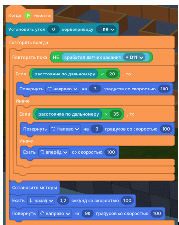 Надо учесть, что в процессе движения машина может не ровно ехать и желательно её выравнивать, немного сдвигая. Например, если расстояние по дальномеру <20, то поворачиваем направо на 3 градуса, а если > 35, то поворачиваем налево также на 3 градуса. Иначе робот едет прямо.