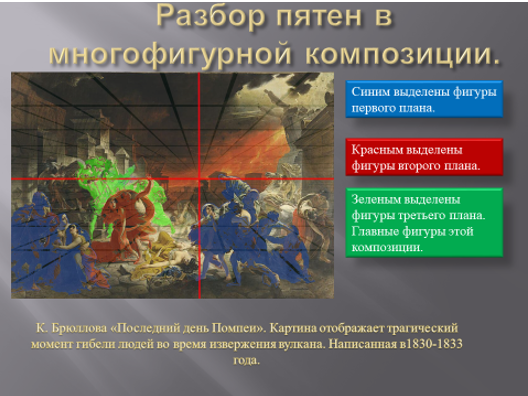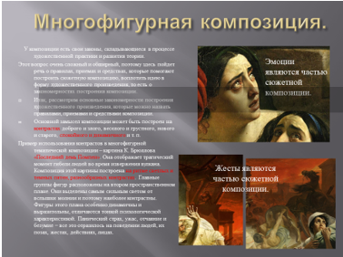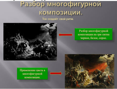 Пример использования контрастов в многофигурной тематической композиции – картина К. Брюллова «Последний день Помпеи». Она отображает трагический момент гибели людей во время извержения вулкана. Композиция этой картины построена на ритме светлых и темных пятен, разнообразных контрастах. Главные группы фигур расположены на втором пространственном плане. Они выделены самым сильным светом от вспышки молнии и поэтому наиболее контрастны. Фигуры этого плана особенно динамичны и выразительны, отличаются тонкой психологической характеристикой. Панический страх, ужас, отчаяние и безумие – все это отразилось на поведении людей, их позах, жестах, действиях, лицах.