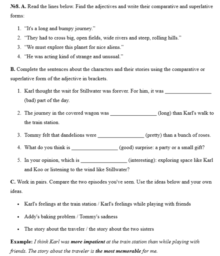 - На первом этапе (часть А) ученики учатся распознавать и преобразовывать прилагательные. Здесь применяется дедуктивный метод: учащиеся используют уже известные им правила образования степеней сравнения, что способствует развитию их аналитических языковых способностей.