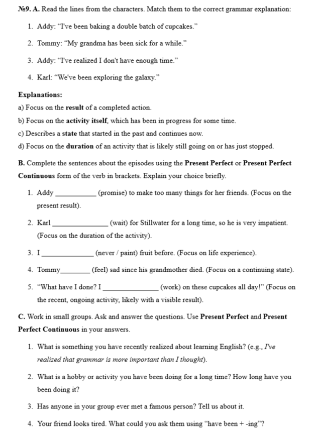 На уровне А ученики должны найти грамматические формы в реальных высказываниях и сопоставить их с функциональными особенностями каждой конструкции. Это помогает сформировать осознанное понимание различий между Present Perfect и Present Perfect Continuous.