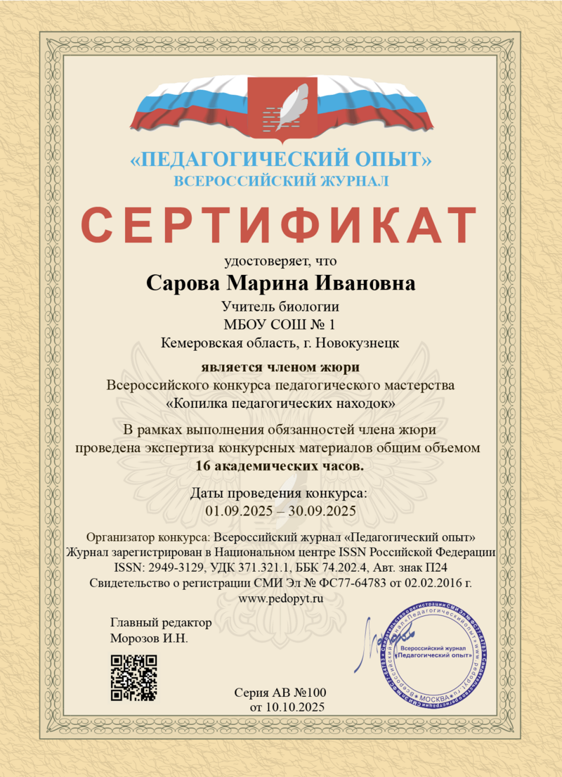 Сертификат члена жюри установленного образца выдается на официальном бланке, подписывается главным редактором и заверяется печатью. Сертификат действителен для аттестации.